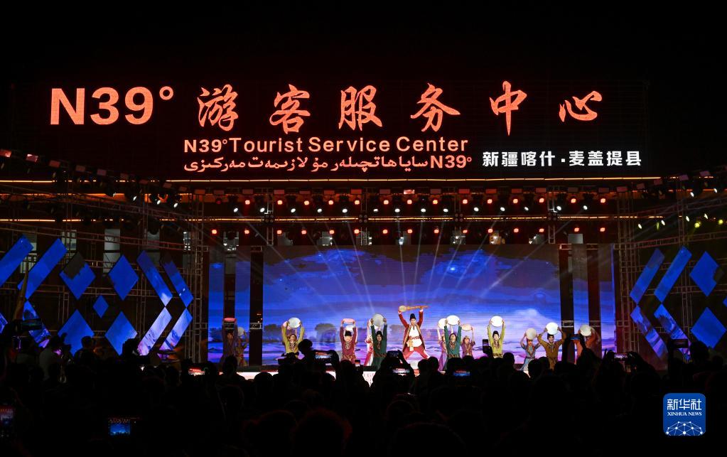 5月22日,在新疆喀什地區麥蓋提縣N39°沙漠旅游景區,人們觀看環塔拉力賽歡迎晚會文藝表演。