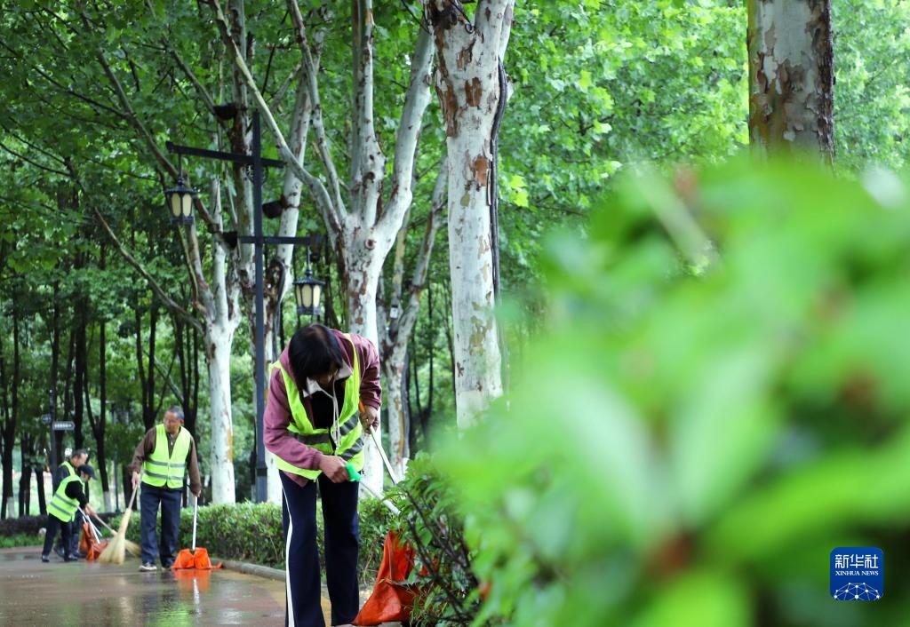 6月4日,在河南省南陽市全民健身公園,環保志愿者和環衛工人在撿拾垃圾。