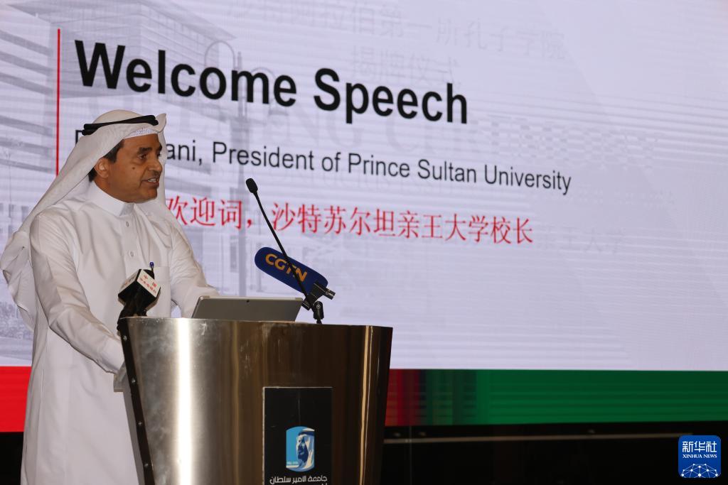 6月4日,在沙特阿拉伯首都利雅得,蘇爾坦親王大學校長艾哈邁德在蘇爾坦親王大學孔子學院揭牌儀式上致辭。