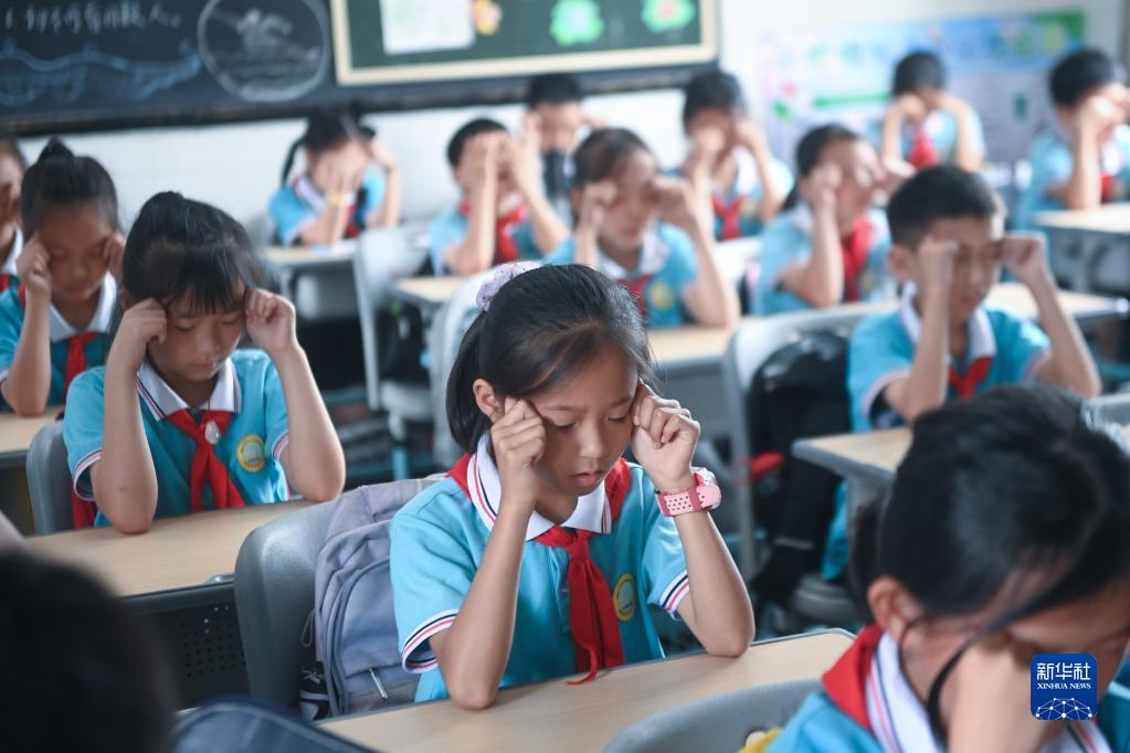 6月5日,東林小學的學生們在愛眼知識課上做眼保健操。