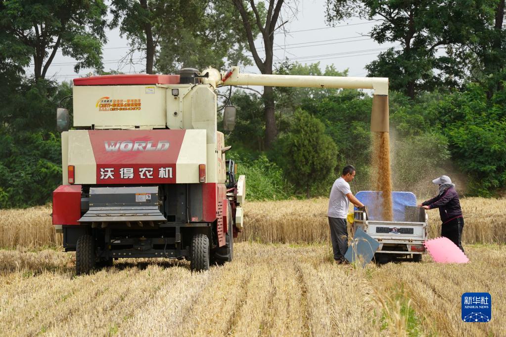 6月5日,農民在河北省沙河市下鄭村的麥田里將收獲的小麥裝車。
