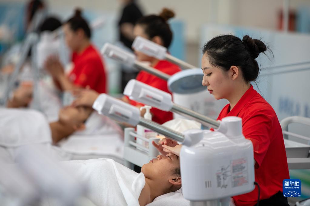 6月5日,在黑龍江省第一屆職業(yè)技能大賽現(xiàn)場,選手在參加美容比賽。