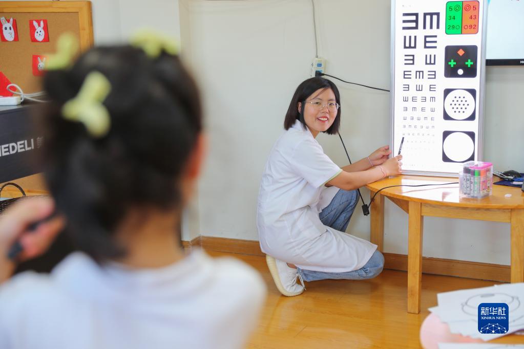 6月5日,在浙江省湖州市德清縣武康街道伊頓幼兒園里,眼科醫(yī)生在給小朋友檢查視力。