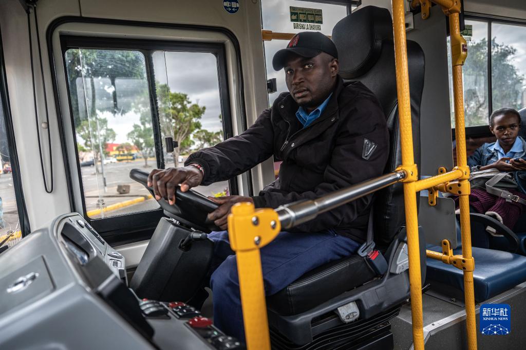 6月3日,肯尼亞電動巴士公司駕駛員駕駛電動巴士行駛在內(nèi)羅畢街頭。