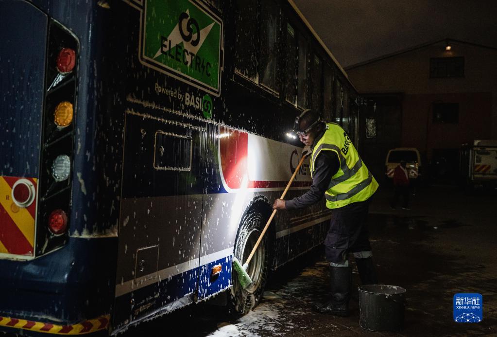 6月2日,在肯尼亞內羅畢,肯尼亞電動巴士公司工作人員清潔電動巴士。