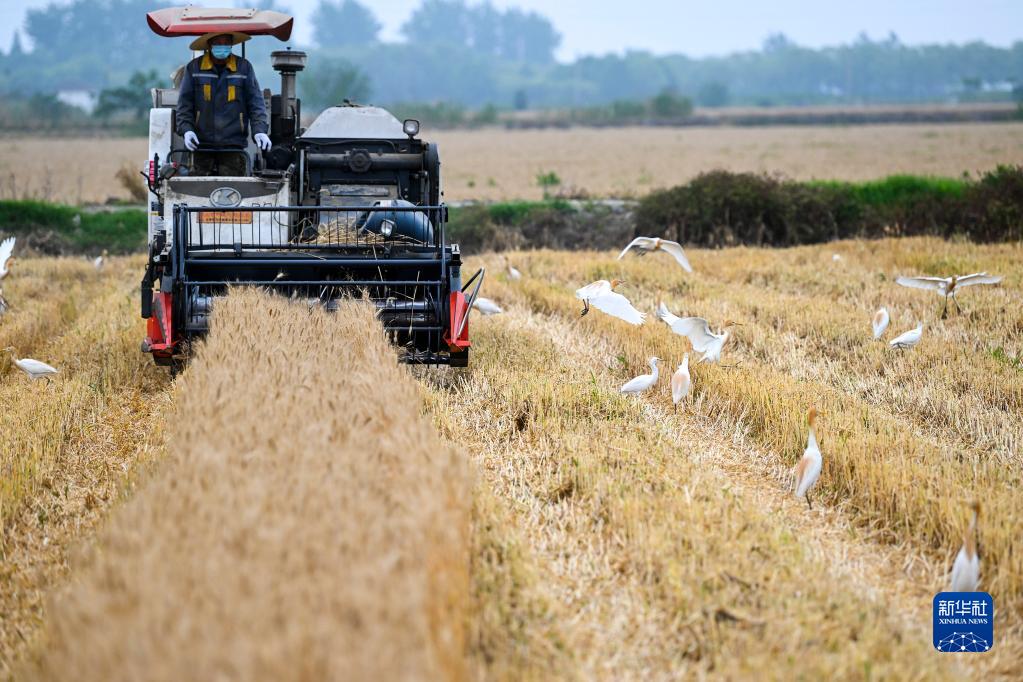 5月21日,農機手在江蘇省昆山市錦溪鎮三聯村麥田里駕駛聯合收割機收割小麥。
