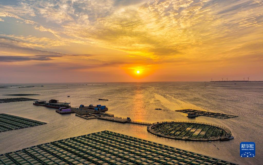 6月5日拍攝的朝霞映襯下的榮成市石島管理區(qū)桑溝灣海洋牧場生態(tài)網(wǎng)箱養(yǎng)殖區(qū)(無人機照片)。