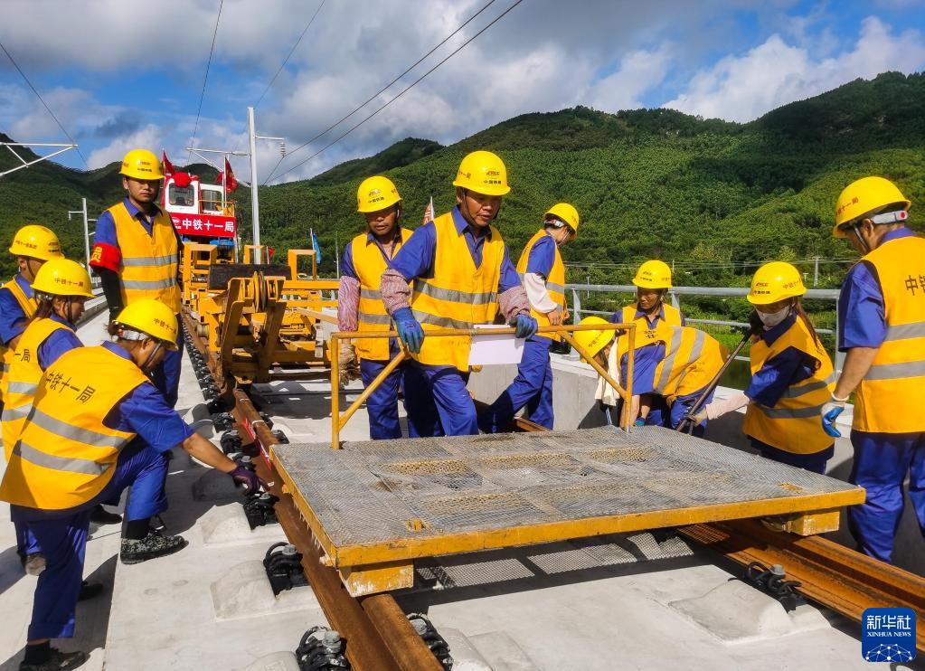 6月6日,中鐵十一局鋪軌機組施工人員在汕汕鐵路汕尾螺河特大橋上進行鋪軌作業。