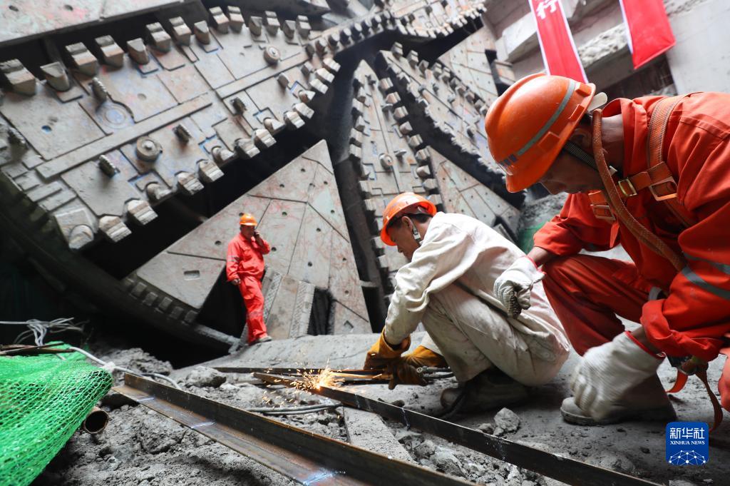 6月6日,施工人員在北橫通道新建工程Ⅷ標段安國路井內進行“縱橫號”盾構接收準備工作。