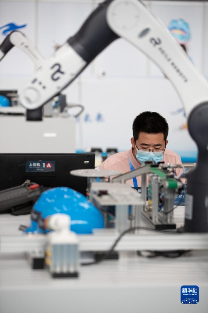 6月6日,選手在進行工業機器人系統操作員項目比賽。