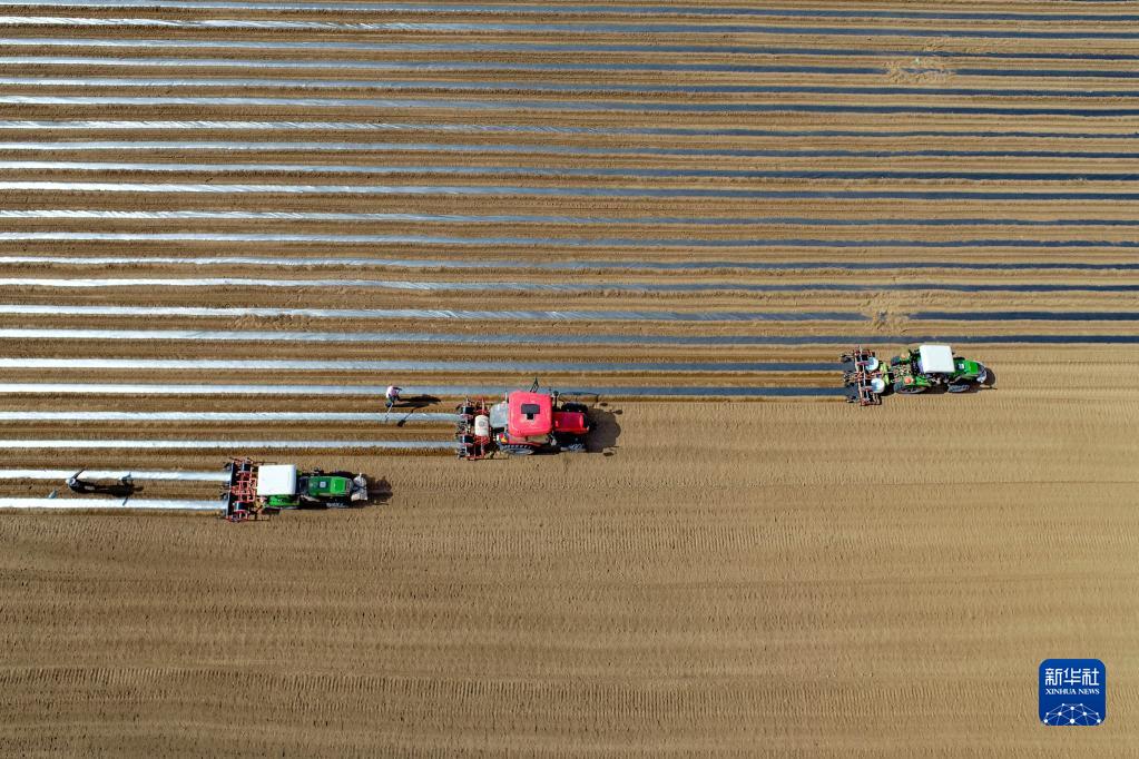 6月6日,農(nóng)機(jī)在鄂托克前旗城川鎮(zhèn)麻黃套村的辣椒種植基地里作業(yè)(無人機(jī)照片)。