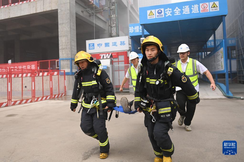 當日,浙江省杭州市富陽區“安全生產月”消防應急演練在中建三局富陽銀湖生物信息產業園項目工地啟動,現場進行火災撲救、人員施救等環節的演練,以提升安全生產應急能力。