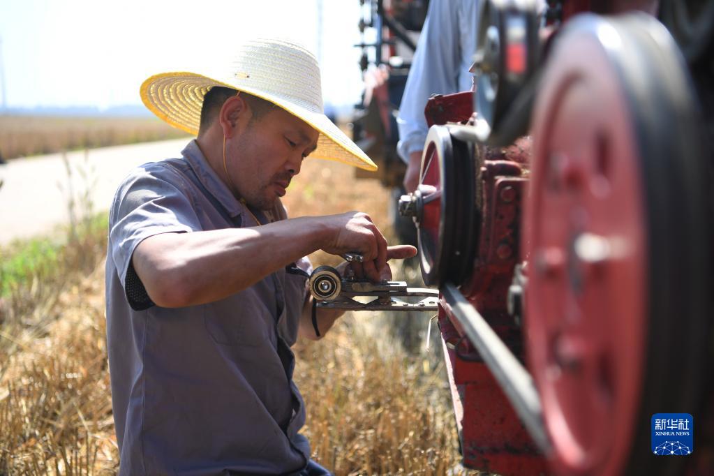 6月6日,在河南省安陽市滑縣萬古鎮,農機手在作業前檢修收割機。