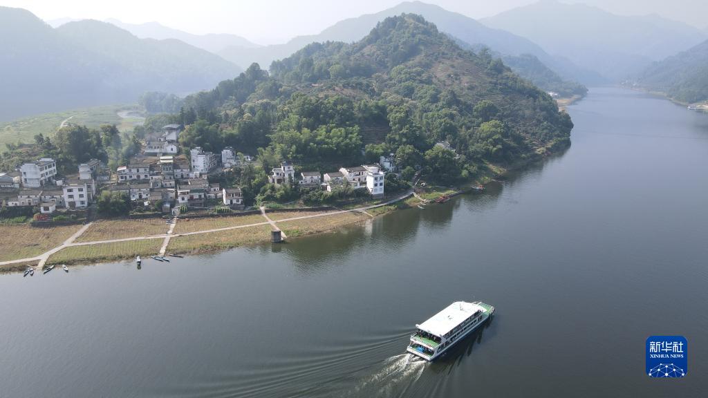 一艘游船行駛在安徽省黃山市歙縣新安江上(6月2日攝,無人機照片)。