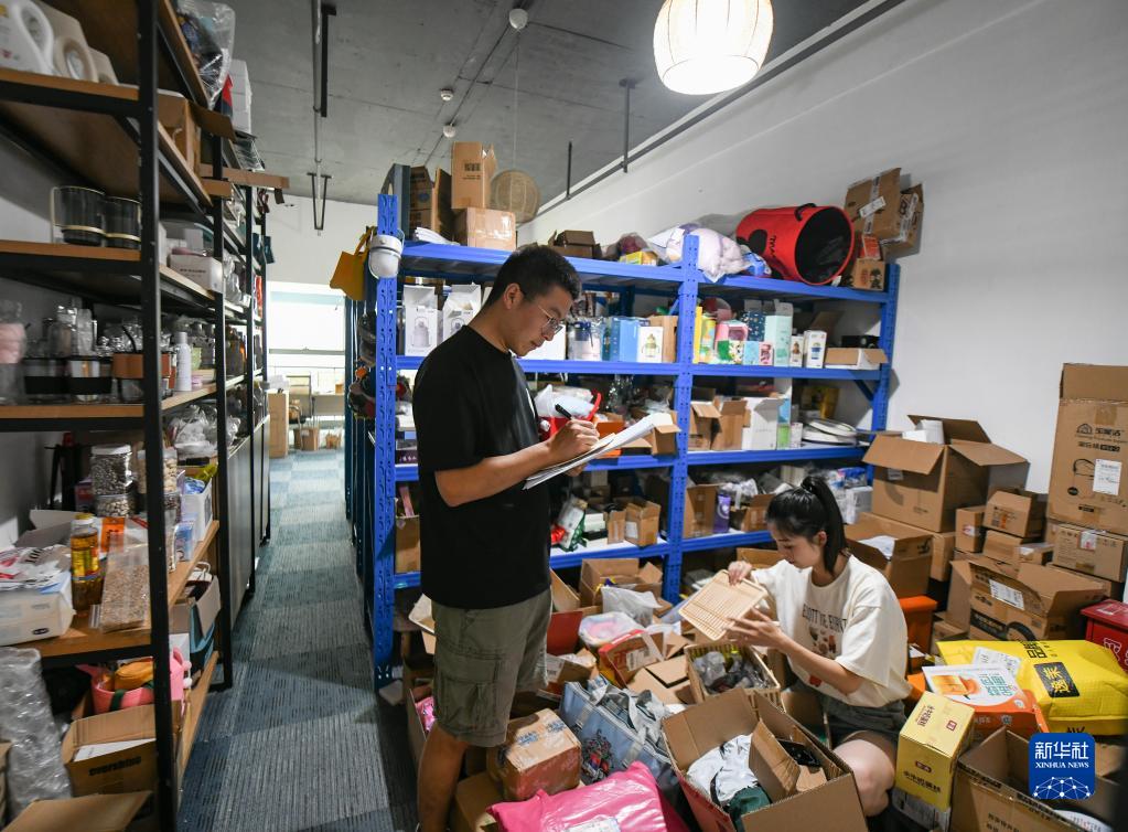 王光強(左)和妻子黃月在成都的電商公司里整理登記各個廠商寄來的產品樣品(6月1日攝)。