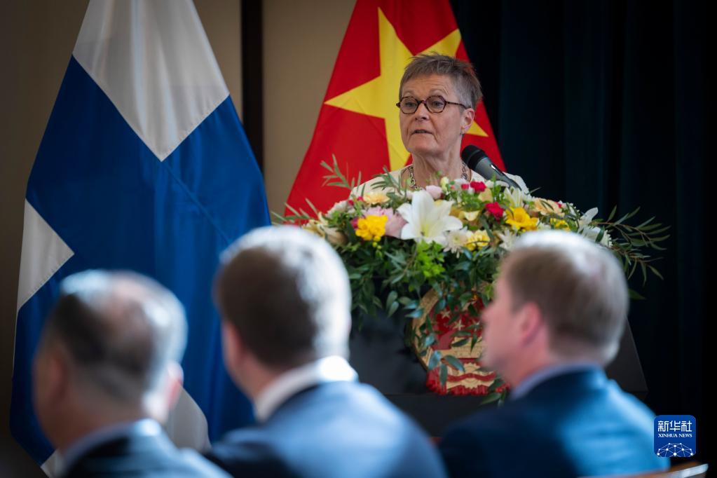 6月5日,芬蘭國家商務(wù)促進局局長尼娜·科波拉在芬蘭赫爾辛基舉辦的以“回顧中芬互利合作70年,攜手面向未來”為主題的研討與慶祝活動現(xiàn)場發(fā)言。