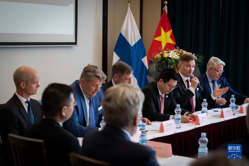 6月5日,芬蘭通力集團副董事長尤西·赫林(右二)在芬蘭赫爾辛基舉辦的以“回顧中芬互利合作70年,攜手面向未來”為主題的研討與慶祝活動現場發言。