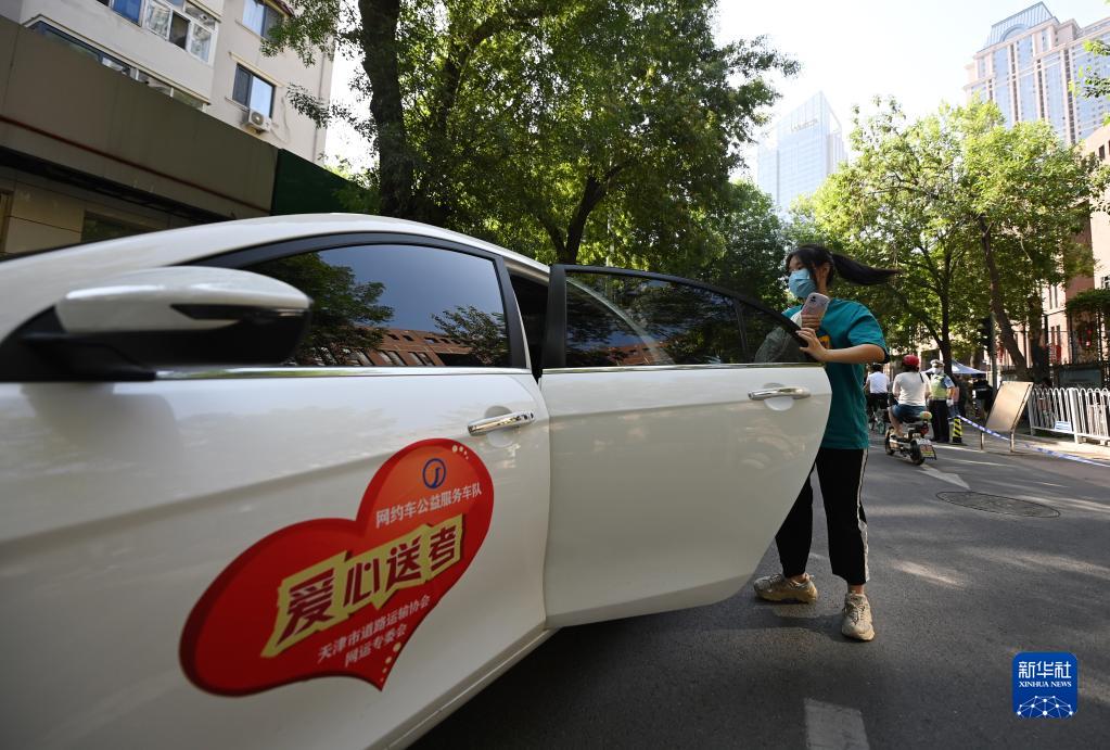 6月7日,在天津市耀華中學考點附近,考生從愛心送考車輛下車。