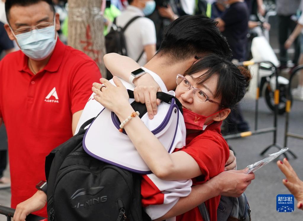 6月7日,在中國人民大學附屬中學考點,送考老師與一位考生擁抱,為他加油鼓勁。