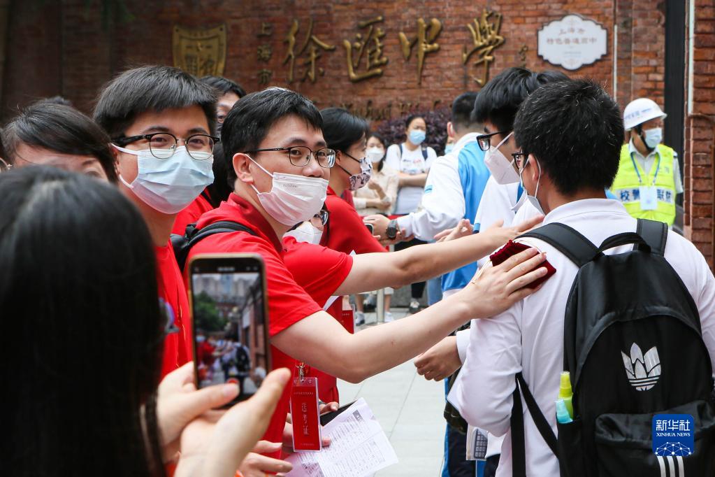 6月7日,送考老師在上海市徐匯中學(xué)考點(diǎn)給考生加油打氣。