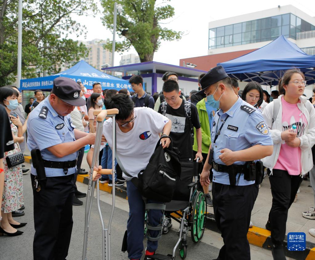 6月7日,在蘇州工業園區星海實驗中學考點外,警察幫助一名行動不便的考生離開考場。