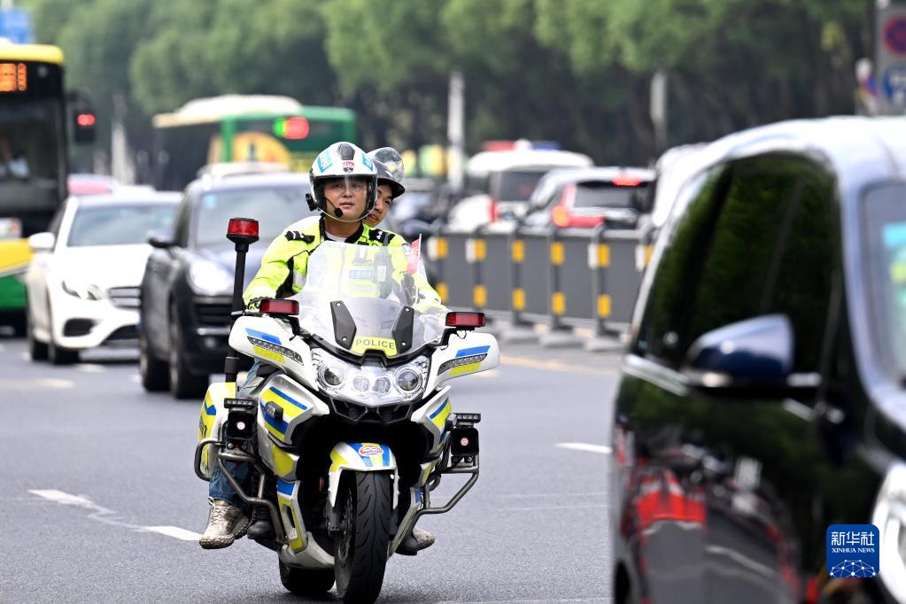 6月7日,在安徽省合肥市第一中學考點,交警護送考生抵達考點。