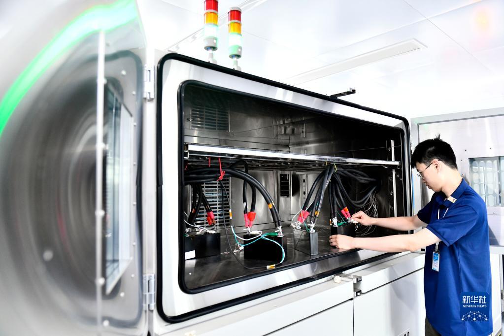 6月6日,在棗莊市國家鋰電池產品質量檢驗檢測中心,工作人員對鋰電池進行檢驗。