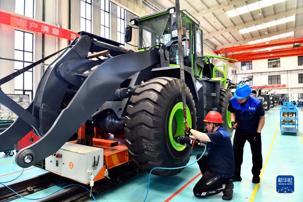 6月6日,在棗莊市山亭區新能源汽車裝備制造園,工作人員在生產電動裝載機。