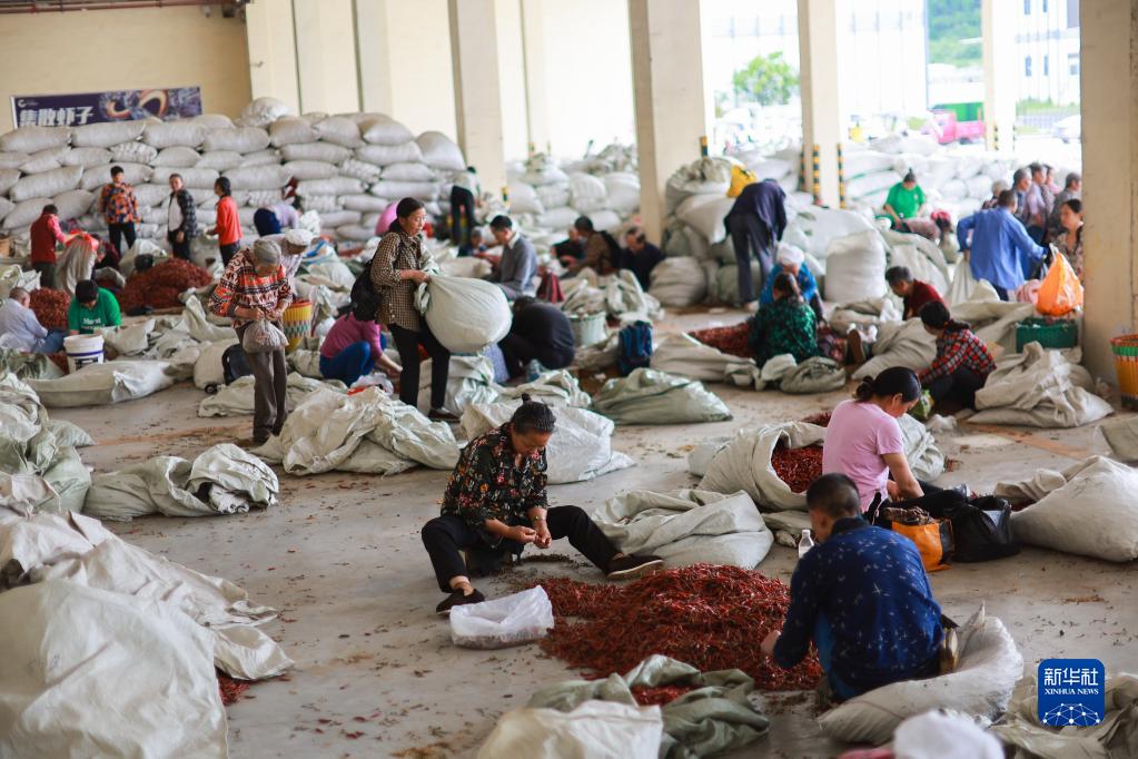6月6日,工人在貴州省遵義市中國辣椒城進行辣椒脫把。
