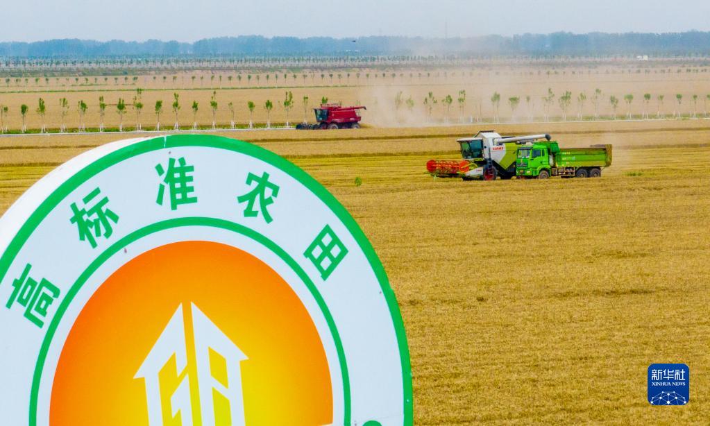 “三夏”時節,在河南省駐馬店市西平縣老王坡高標準農田,農機手操作大型收割機收割小麥,田間地頭一派忙碌景象。