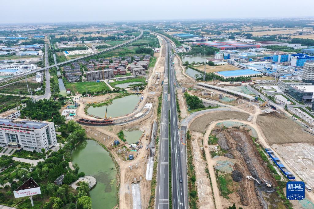 工人在長深高速公路連云港至淮安段擴建工程灌南互通工程現場施工(6月7日攝,無人機照片)。