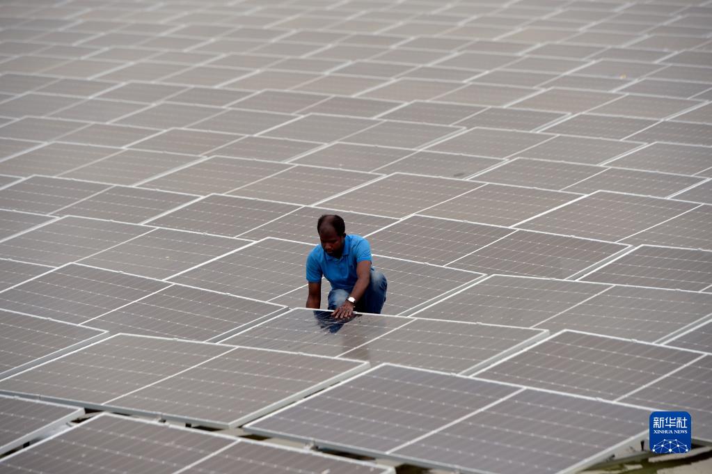 6月5日,在孟加拉國(guó)查帕伊諾瓦布甘杰,工作人員檢查水上漂浮太陽(yáng)能光伏發(fā)電站運(yùn)行情況。