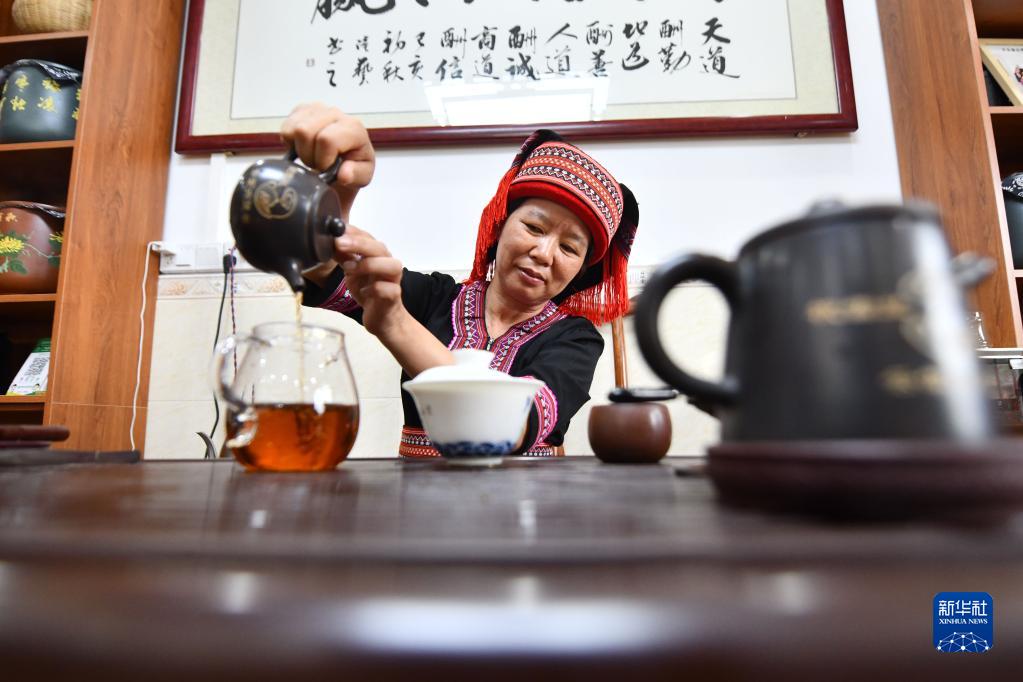 6月7日,在蒼梧縣六堡鎮山坪村,祝雪蘭在工作室里泡茶。