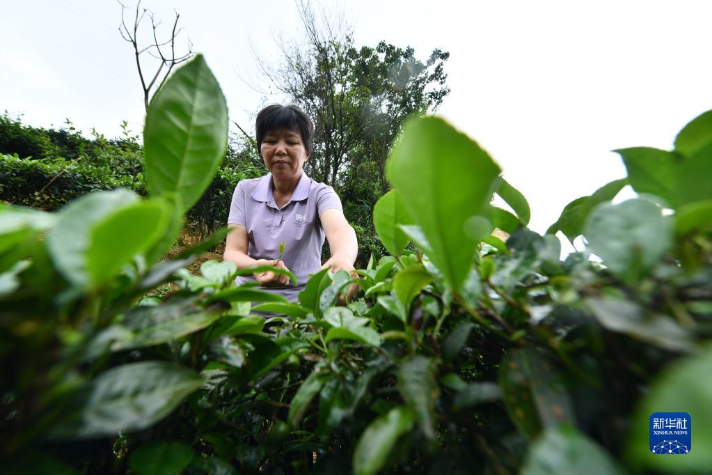 6月7日,在蒼梧縣六堡鎮山坪村,祝雪蘭在采茶。