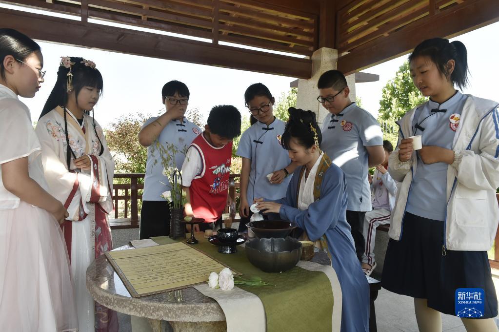 6月8日,學生們在活動現場觀賞傳統茶藝展演。