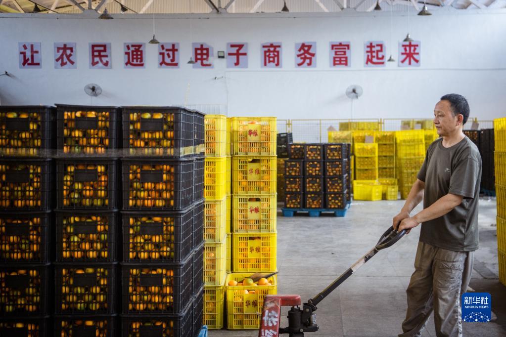 6月8日,在秭歸縣華維電商物流園區內,工作人員搬運臍橙。