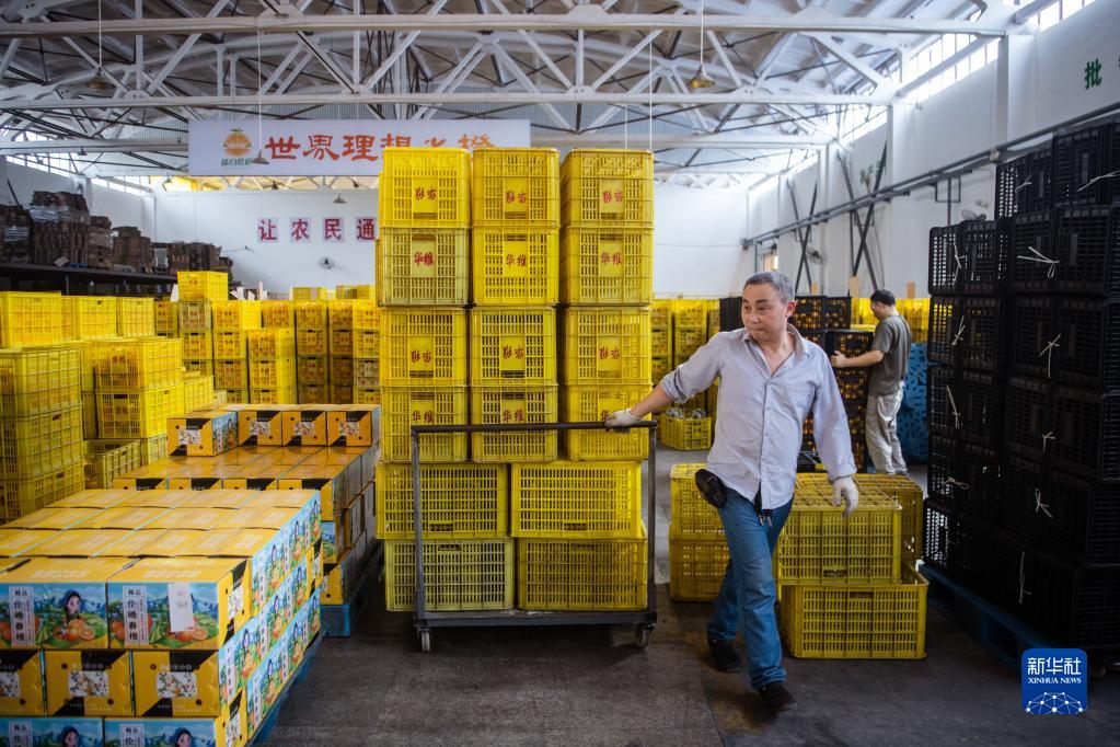 6月8日,在秭歸縣華維電商物流園區內,工作人員搬運臍橙。