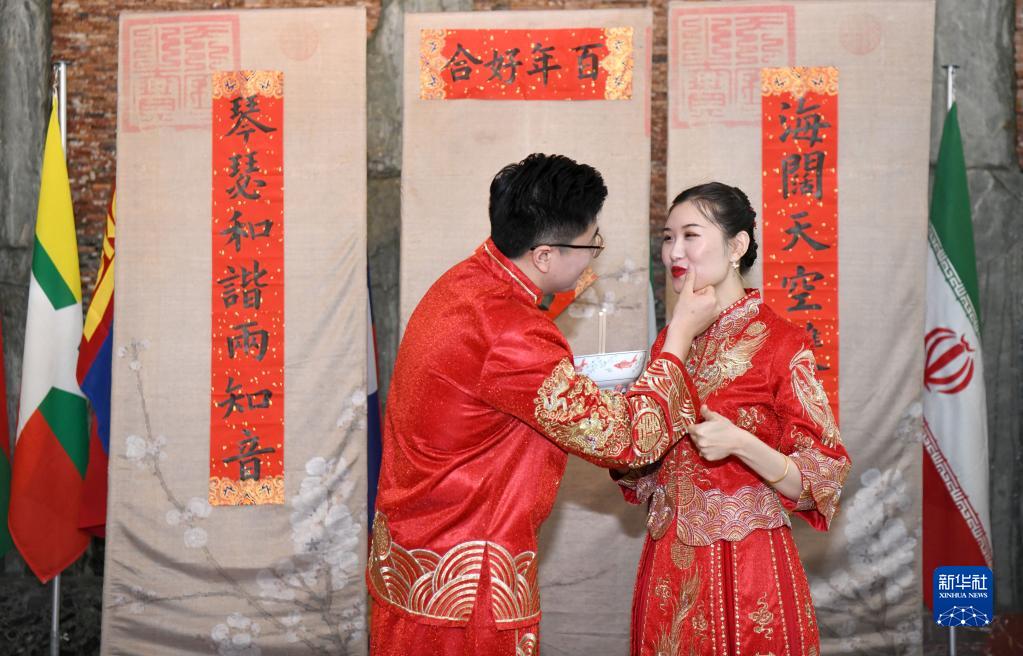 6月7日,在瑞士日內瓦,中國常駐聯合國日內瓦辦事處和瑞士其他國際組織代表團的新郎齊林和新娘張秋若在以亞洲婚俗文化為主題的第三屆日內瓦“亞洲文化節”上舉辦中式婚禮。