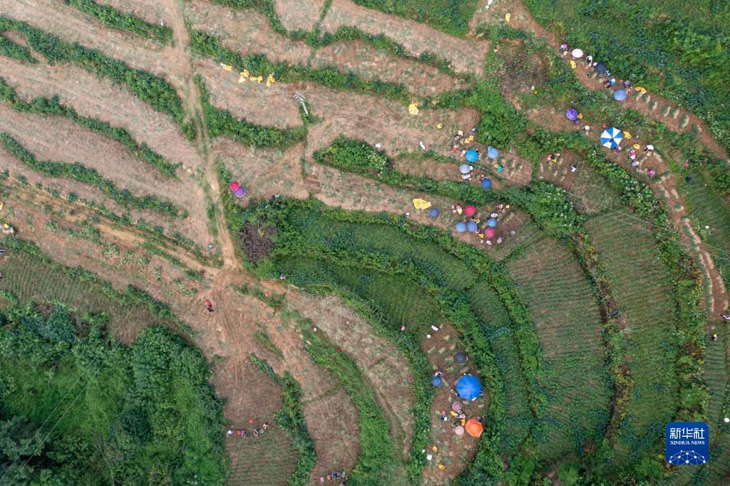 6月8日,在豐都縣虎威鎮大池社區的藠頭田,當地村民在種植大戶的組織下集體采收藠頭(無人機照片) 。