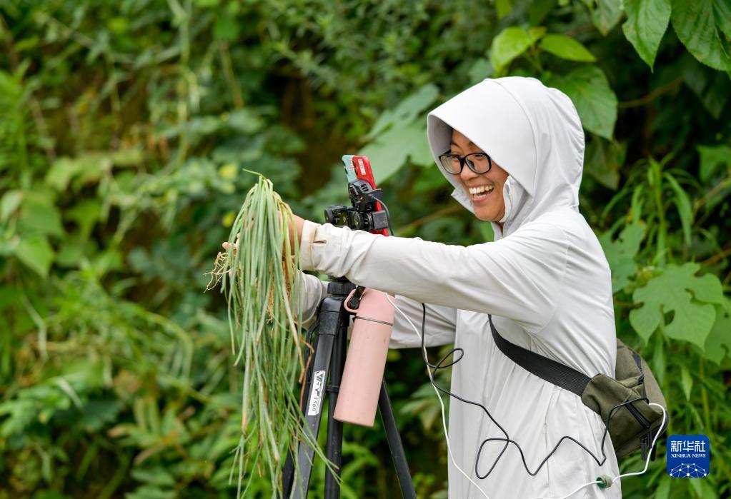 6月8日,在豐都縣虎威鎮大池社區的藠頭田,一名網絡主播通過網絡推介豐都藠頭。