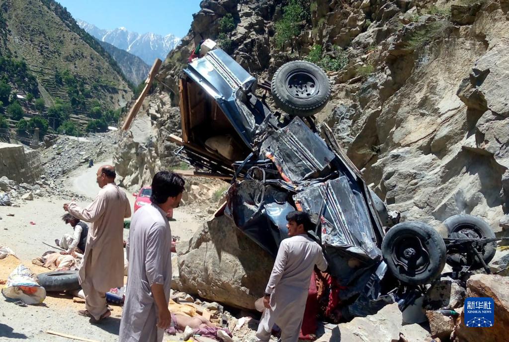 6月8日,在巴基斯坦開伯爾-普什圖省的上迪爾地區(qū),人們聚集在墜入峽谷的車輛周圍。
