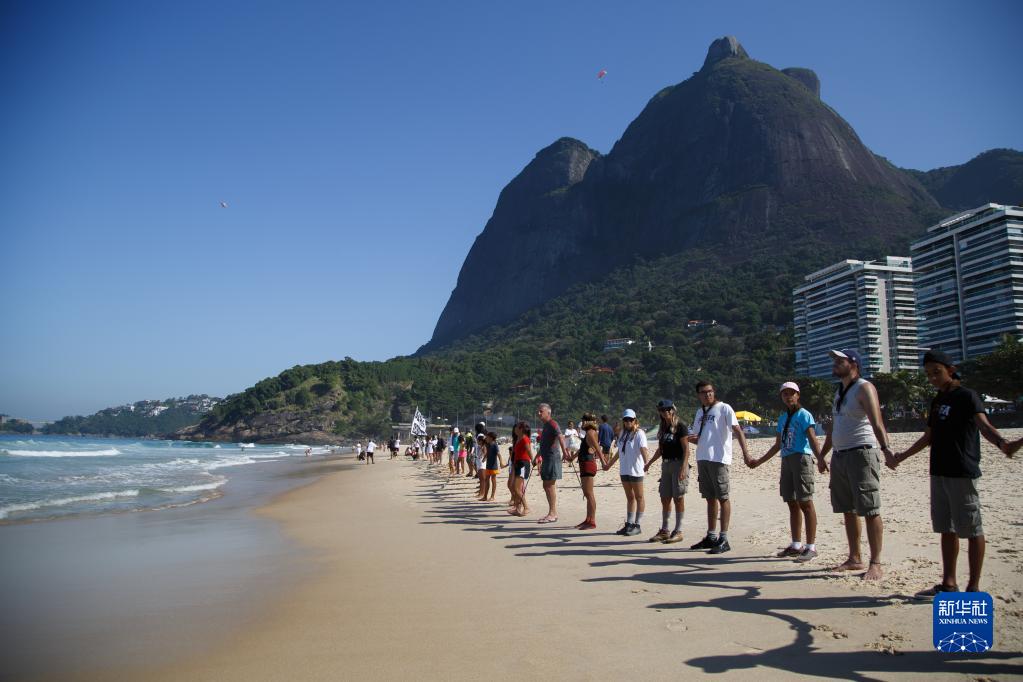 6月8日,在巴西里約熱內盧圣孔拉杜海灘,志愿者手拉手“擁抱”海洋。