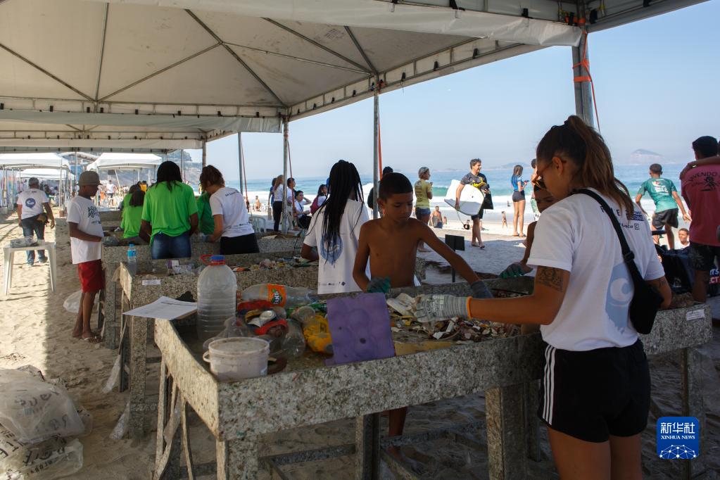 6月8日,在巴西里約熱內盧圣孔拉杜海灘,志愿者將收集到的垃圾進行分類。