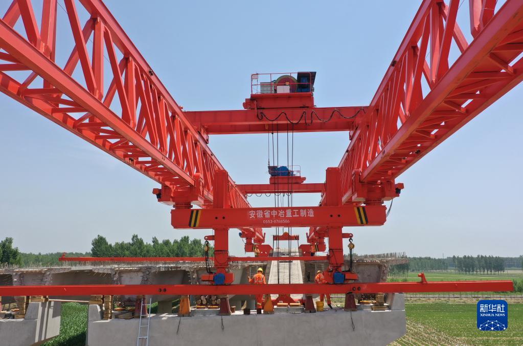 6月8日,工人在河北省昌黎縣境內(nèi)的秦唐高速三標(biāo)段建設(shè)工地施工(無(wú)人機(jī)照片)。