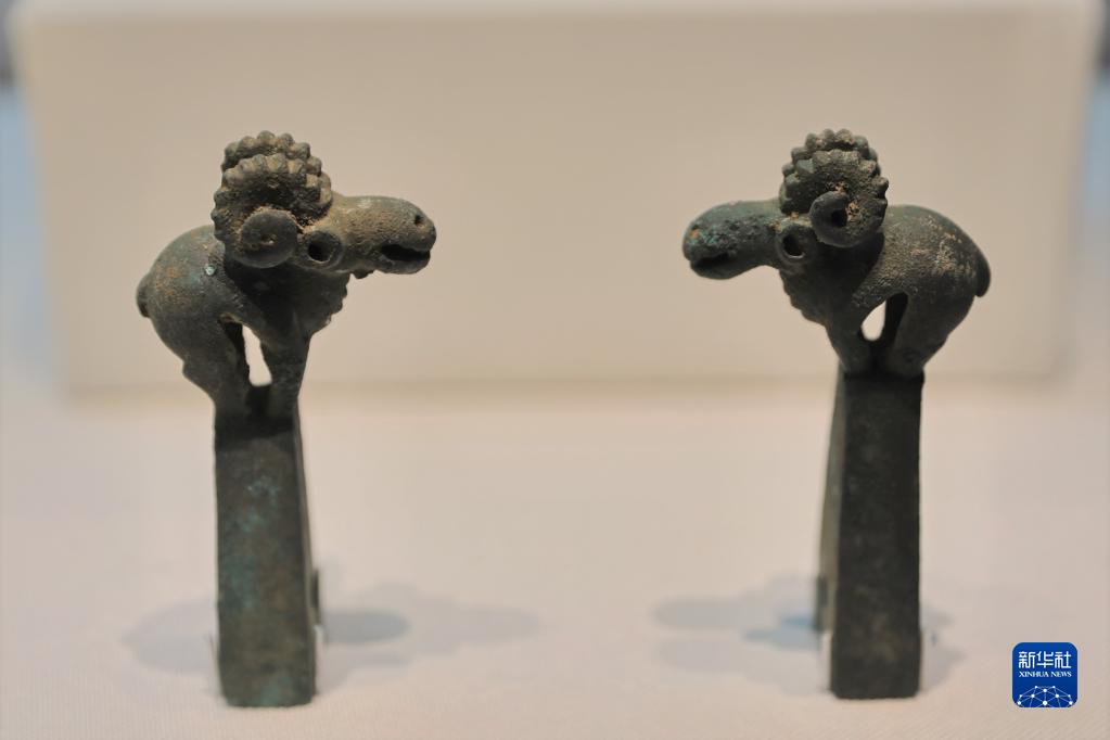 6月9日在“鄂爾多斯青銅器文物精品展”拍攝的展品“盤角羊形青銅桿頭飾”。
