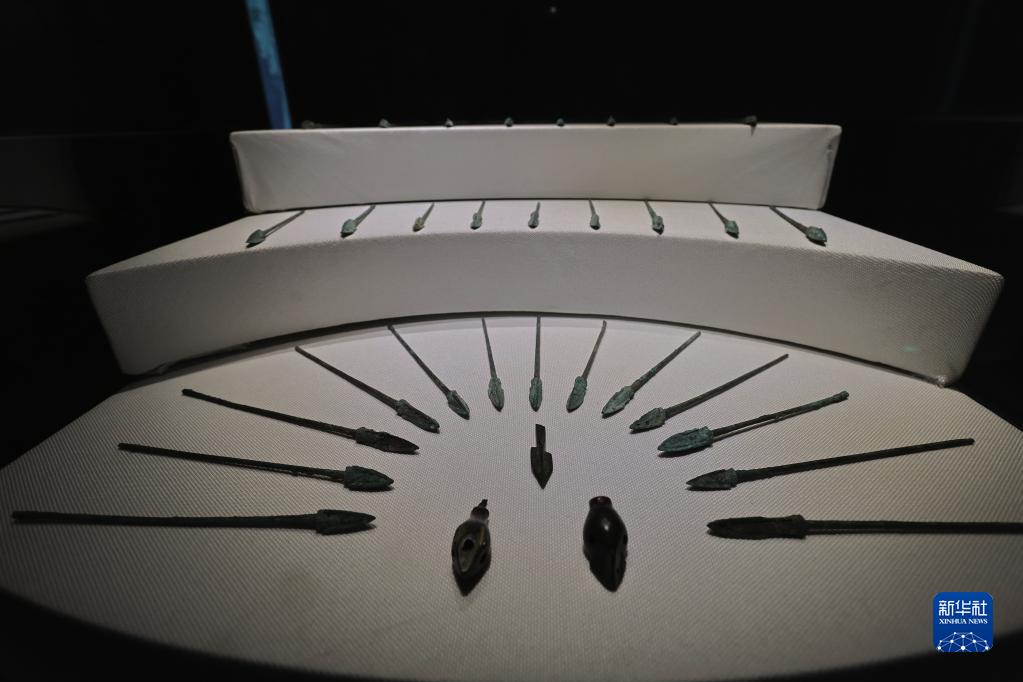 6月9日在“鄂爾多斯青銅器文物精品展”拍攝的展品“青銅鏃”。