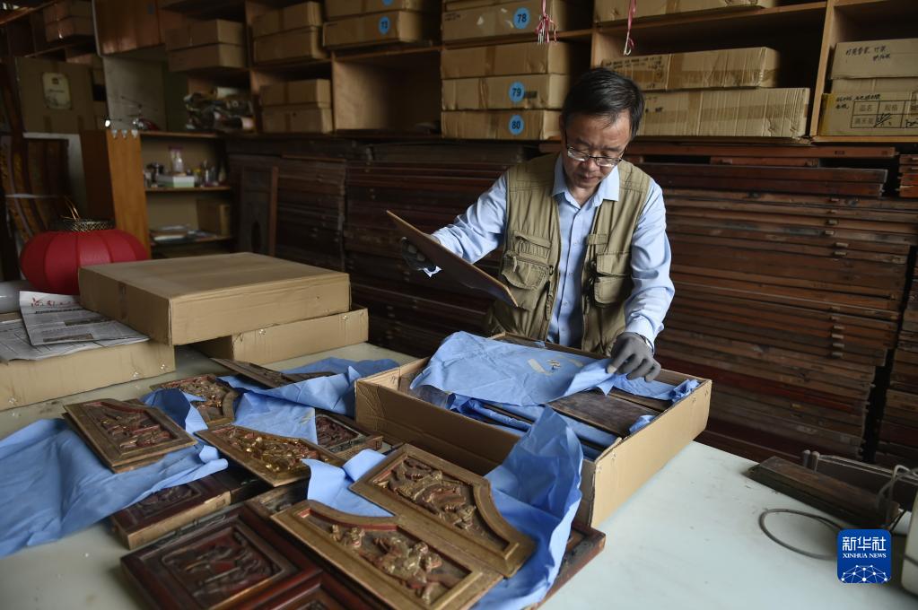 6月7日,張俊濤在庫房內整理自己收集的家用傳統木雕。