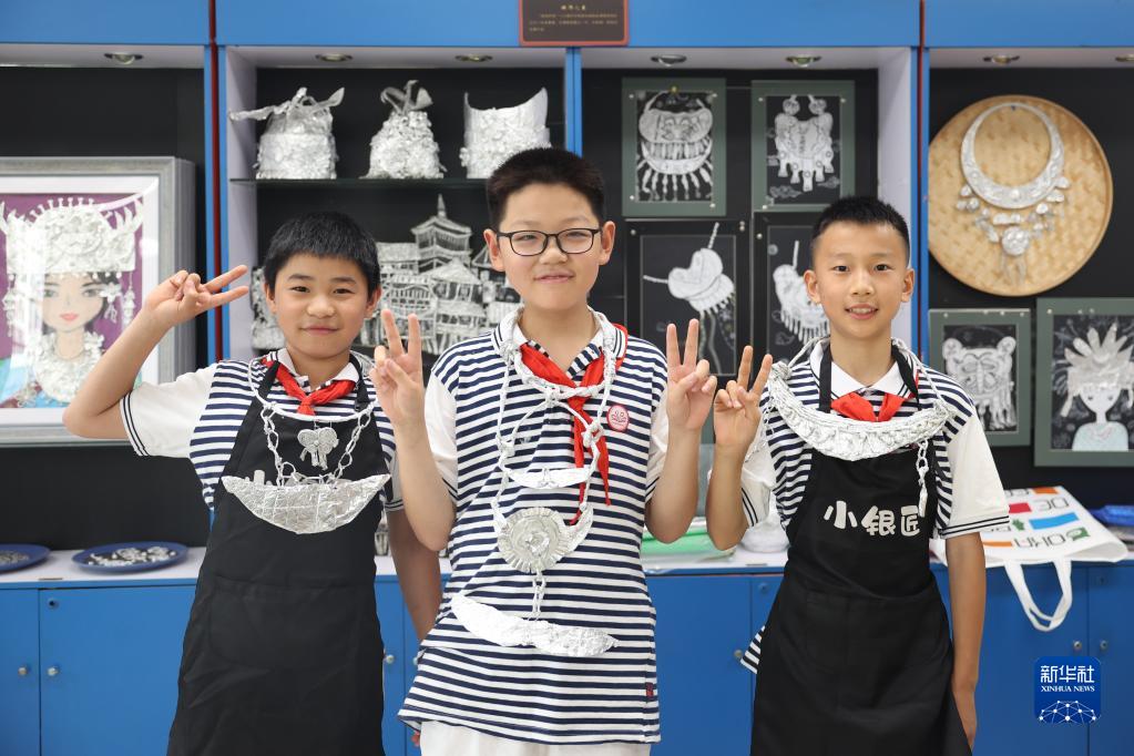 6月9日,湖南省長沙市朝陽小學學生們在特色美育課上展示有苗族銀飾特色的手工作品。