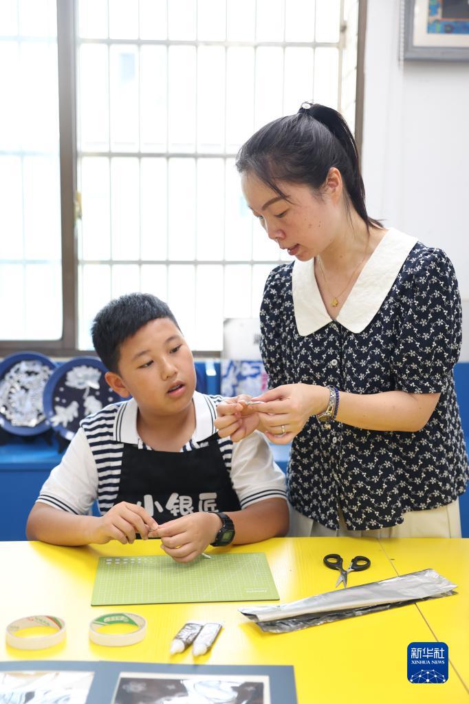 苗族銀飾鍛制技藝是苗族喜愛的民間傳統工藝,主要用于制作頭飾、面飾、頸飾、手飾等苗族飾品。近年來,在湖南省文化館(湖南省非物質文化遺產保護中心)的支持下,長沙市朝陽小學開設“無銀無花不成美”特色美育課程,教授苗族銀飾的歷史淵源、造型特點、主要分類、工藝流程、服飾搭配技巧等,學生們在課堂上可以利用錫箔紙、易拉罐、零食包裝袋等生活中便于獲取的材料制作有苗族銀飾特色的手工作品,讓學生們在對苗族銀飾的欣賞與制作中,感受非遺之美,傳承優秀的傳統文化。