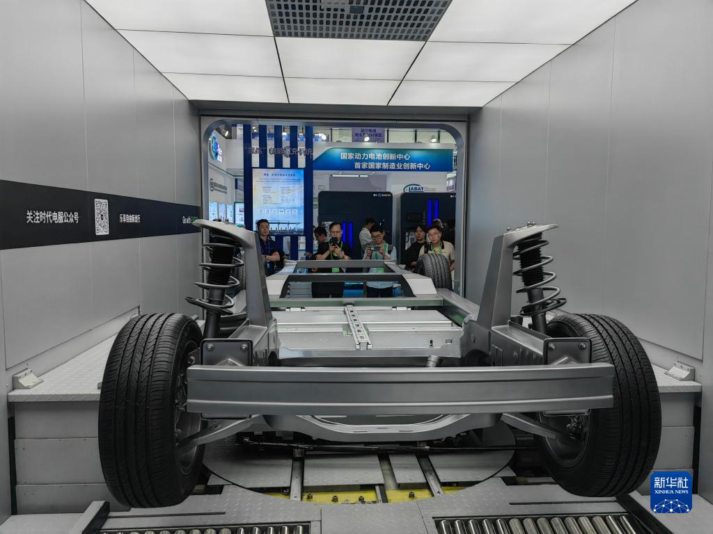 這是展覽會上展示的新能源汽車換電系統(6月9日攝)。